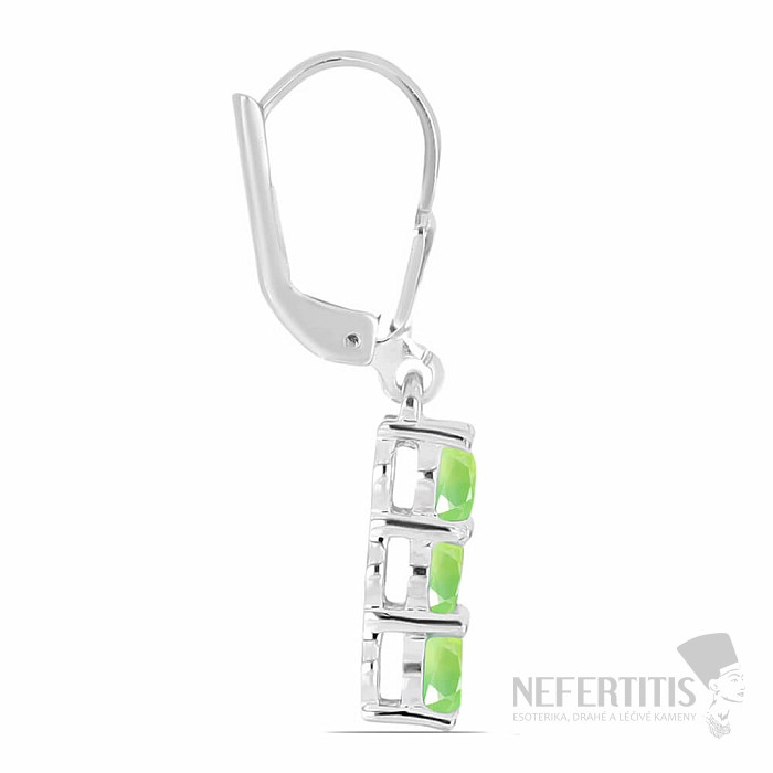Exkluzívne strieborné náušnice z dizajnového radu Nefertitis Collection s kabošonmi prehnitu. Kamene sú zasadené do rhodiovaného striebra , ktorého povrch pripomína vzhľad bieleho zlata, náušnice tak pôsobia luxusným dojmom. Rhodiované striebro je menej náchylné na oxidáciu (černanie) povrchu. Krásny trblietavý šperk s čírymi kameňmi klenotníckej kvality, ktorých krása je zdôraznená dopadom svetla na jednotlivé plôšky výbrusu, vhodný na rôzne príležitosti. Rhodiované striebro Ag 925/1000. Veľkosť jednotlivých kabošonov cca 3,5 mm. Ilustratívne vyobrazenie.