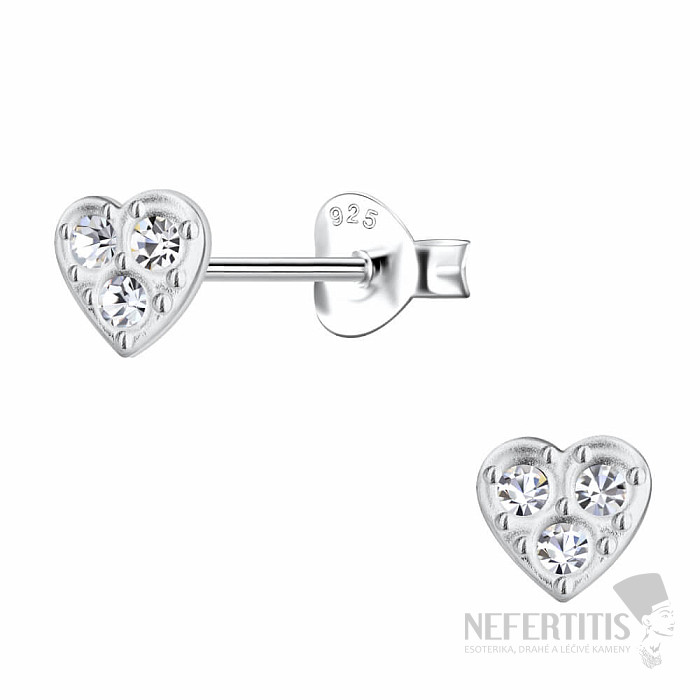 Tieto strieborné náušnice kôstky 925/1000 sú tvarované do jemného srdiečka , ktoré je osadené tromi čírymi kubickými zirkónmi. Kompozícia kameňov vytvára harmonický a vyvážený ligot bez toho, aby šperk pôsobil výrazne alebo rušivo.
