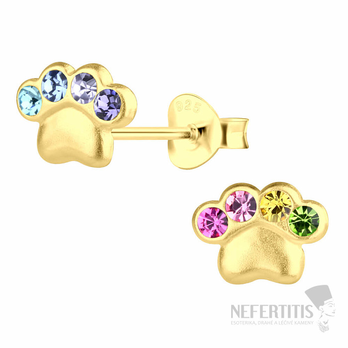 Tieto strieborné náušnice kôstky 925/1000 sú tvarované do obľúbeného motívu labky a osadené štyrmi farebnými kubickými zirkónmi , ktoré vytvárajú jemný, ale neprehliadnuteľný lesk. Povrch náušníc je pozlátený 14-karátovým zlatom a následne chránený vrstvou e-coating, ktorá zaisťuje dlhodobú krásu a odolnosť.