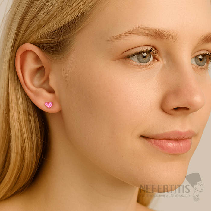 Tieto jemné strieborné náušnice typu kôstky sú vyrobené zo striebra rýdzosti 925/1000 a osadené ružovými zirkónmi s priemerom 4 mm v tvare srdca. Ich hmotnosť činí 0,5 g, čo z nich robí ľahký a pohodlný šperk na každodenné nosenie. Puzetové zapínanie.