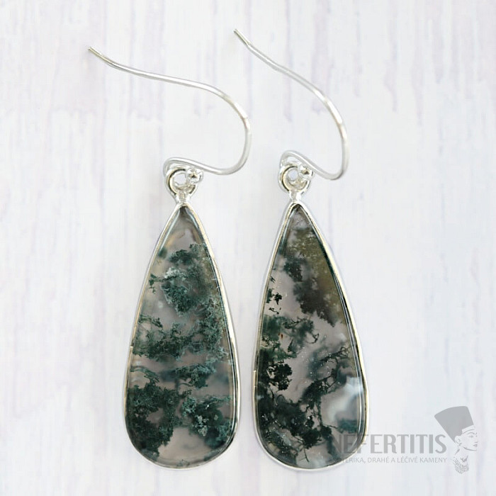 Nádherné strieborné náušnice s machovým achátom. Ag 925. Inklúzia železa vytvára v acháte vzory pripomínajúce mach alebo lišajník. Veľké množstvo inklúzií robí tento šperk očarujúce a úplne nezameniteľný. Uvedená váha je celého páru. Kupujete priamo vyobrazený pár.