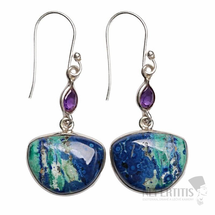 Exkluzívne, očarujúce strieborné náušnice s azuritom v malachite a brúseným ametystom. Kombinácia azuritu s malachitom pripomínajúca pohľad na planétu Zem z vtáčej perspektívy robí tento šperk nevšedným a veľmi dekoratívnym. Ag 925. Kupujete priamo vyobrazený šperk.