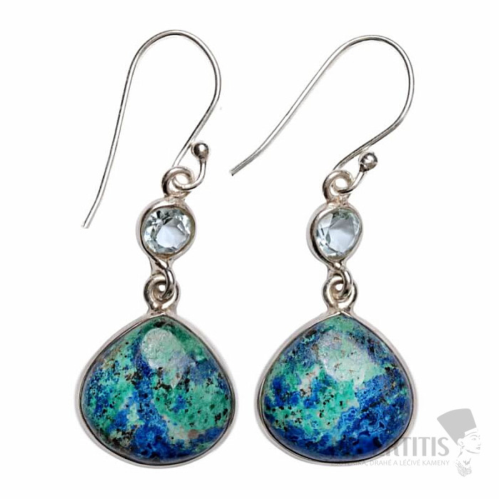 Exkluzívne, očarujúce strieborné náušnice s azuritom v malachite a brúseným topazom. Kombinácia azuritu s malachitom pripomínajúca pohľad na planétu Zem z vtáčej perspektívy robí tento šperk nevšedným a veľmi dekoratívnym. Ag 925. Kupujete priamo vyobrazený šperk.