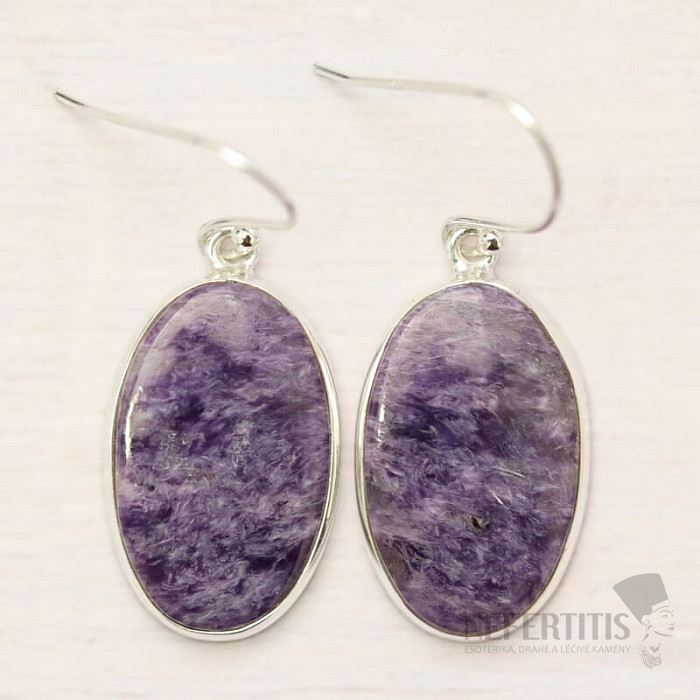 Výrazné strieborné náušnice z čaroitu výbornej kvality. Ag 925. Nádherne fialovo sfarbený čaroit vás očarí nielen svojim hodvábnym leskom, ale aj premenou kresby v meniacom sa svetle. Uvedená váha je celého páru. Kupujete priamo vyobrazený šperk.
