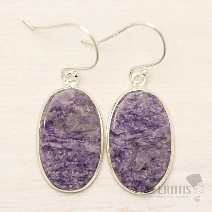 Výrazné strieborné náušnice z čaroitu výbornej kvality. Ag 925. Nádherne fialovo sfarbený čaroit vás očarí nielen svojim hodvábnym leskom, ale aj premenou kresby v meniacom sa svetle. Uvedená váha je celého páru. Kupujete priamo vyobrazený šperk.