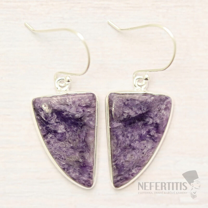 Výrazné strieborné náušnice z čaroitu výbornej kvality. Ag 925. Nádherne fialovo sfarbený čaroit vás očarí nielen svojim hodvábnym leskom, ale aj premenou kresby v meniacom sa svetle. Uvedená váha je celého páru. Kupujete priamo vyobrazený šperk.