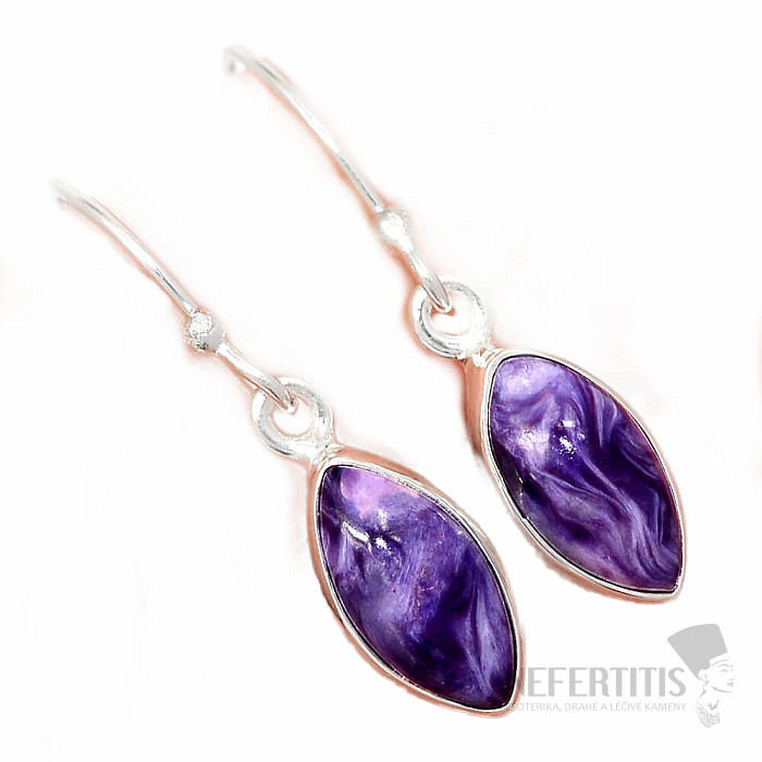 Výrazné strieborné náušnice z čaroitu výbornej kvality. Ag 925. Nádherne fialovo sfarbený čaroit vás očarí nielen svojim hodvábnym leskom, ale aj premenou kresby v meniacom sa svetle. Uvedená váha je celého páru. Kupujete priamo vyobrazený šperk.