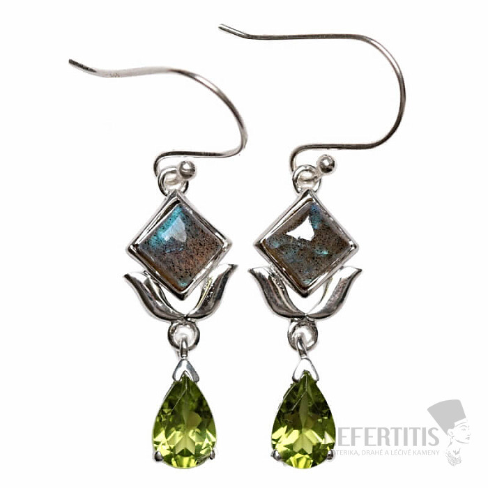 Atraktívne strieborné dizajnové náušnice s labradoritmi s výraznou hrou farieb, v ktorej sa pri dopade svetla kúzelne rozžiari jasná modrá farba, a brúsenými olivínmi. Ag 925. Uvedená váha je celého páru. Kupujete priamo vyobrazený šperk.