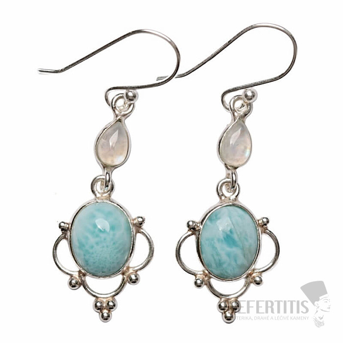 Atraktívne strieborné dizajnové náušnice s larimarom a mesačným kameňom . Ag 925. Uvedená váha je celého páru. Kupujete priamo vyobrazený šperk. Larimar, tiež zvaný ako „kameň delfínov“, patrí medzi najvzácnejšie… viac »
