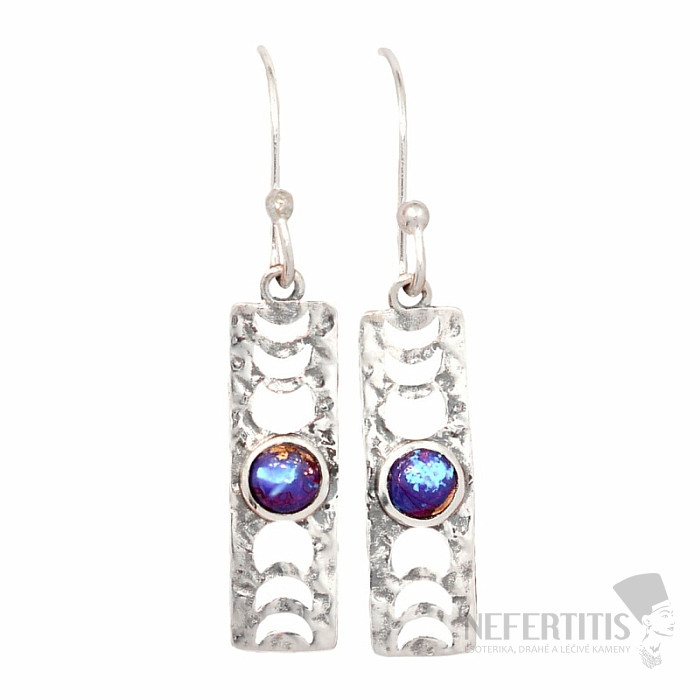 Atraktívne strieborné dizajnové náušnice s kúskami tyrkysu , spájaných meďou do kabošonov modro fialovej farby. Tento typ šperkov získava vo svete na veľkej obľube z dôvodu stále rastúcej ceny jednoliatych kusov prírodného tyrkysu. Tyrkys v šperkoch nosia šťastie a podporuje lásku. Meď je od nepamäti používaná ako silný liečivý prostriedok v mnohých kultúrach po celom svete. Prvá zmienka o liečivých účinkoch medi je už na egyptskom papyruse z obdobia 2600 až 2200 rokov pred Kristom. Ag 925. Uvedená váha je celého páru. Kupujete priamo vyobrazený šperk.