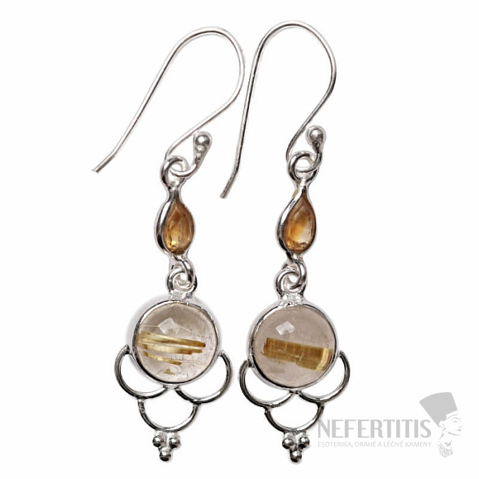 Atraktívne strieborné dizajnové náušnice so sagenity a brúsenými citríny. Sagenit doslova žiari zlatavými inklúziami "zlatého" rutilu ako slniečko na letnej oblohe. Veľmi optimistický a dobrú náladu už od pohľadu dávajúci šperk. Ag 925. Uvedená váha je celého páru. Kupujete priamo vyobrazený pár.