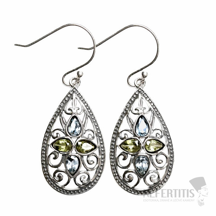 Atraktívne strieborné dizajnové náušnice s fazetovanými modrými topazmi a olivíny. Ag 925. Uvedená váha je celého páru. Kupujete priamo vyobrazený šperk.