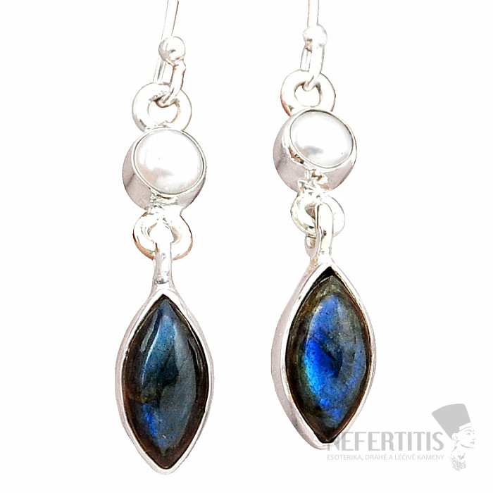 Krásne strieborné náušnice s labradoritmi s výraznou hrou farieb, v ktorej sa pri dopade svetla kúzelne rozžiari jasná modrá farba a perlami. Ag 925. Uvedená váha je celého páru. Kupujete priamo vyobrazený šperk.
