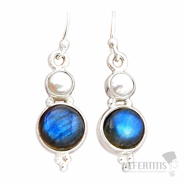 Krásne strieborné náušnice s labradoritmi s výraznou hrou farieb, v ktorej sa pri dopade svetla kúzelne rozžiari jasná modrá farba a perlami. Ag 925. Uvedená váha je celého páru. Kupujete priamo vyobrazený šperk.