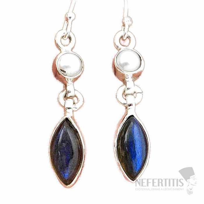 Krásne strieborné náušnice s labradoritmi s výraznou hrou farieb, v ktorej sa pri dopade svetla kúzelne rozžiari jasná modrá farba a perlami. Ag 925. Uvedená váha je celého páru. Kupujete priamo vyobrazený šperk.