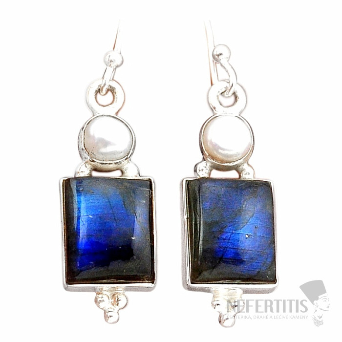 Krásne strieborné náušnice s labradoritmi s výraznou hrou farieb, v ktorej sa pri dopade svetla kúzelne rozžiari jasná modrá farba a perlami. Ag 925. Uvedená váha je celého páru. Kupujete priamo vyobrazený šperk.