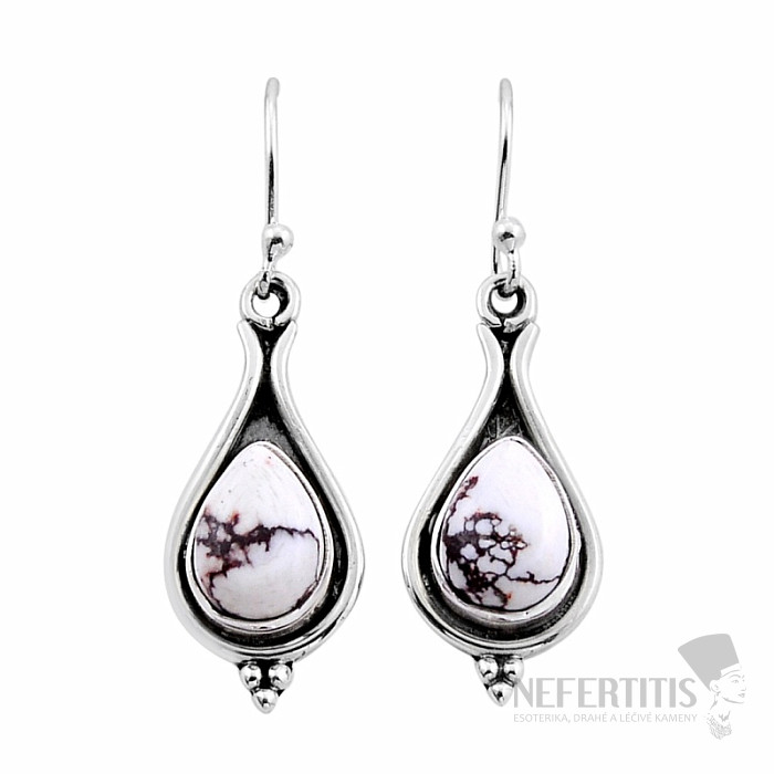 Strieborné náušnice s magnezitom Wild horse, nachádzajúcim sa v Arizone. Ag 925. Tento druh magnezitu má neopakovateľnú, nezameniteľnú kresbu - krásne mramorovanie v bielom magnezite. Uvedená váha je celého páru. Kupujete priamo vyobrazený šperk.