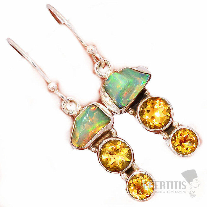 Očarujúce strieborné náušnice so surovými, zaleštenými opálmi, s krásnou hrou farieb, a brúsenými citríny. Ag 925. Pôsobivý a elegantný šperk, od pohľadu navodzujúci radosť a pocity harmónie. Etiópske opály oproti austrálskym opálom doslova hýria až neónovo žiarivými odleskami farieb. Hoci na prvý pohľad na to nevyzerajú, ohňostroj farieb, ktorý z opálu v týchto náušniciach vytryskne pri každom dopade svetla, očarí nielen vás, ale celé vaše okolie. Uvedená váha je celého páru. Kupujete priamo vyobrazený šperk.