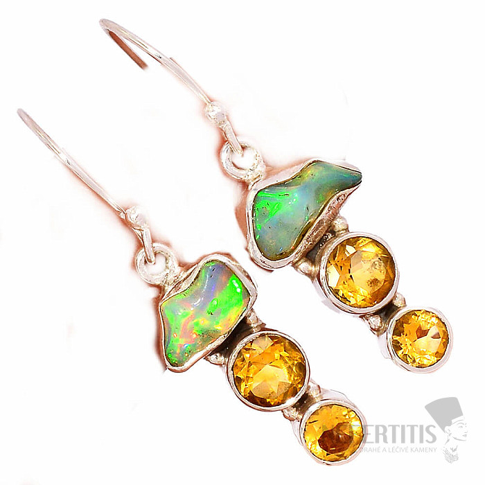 Očarujúce strieborné náušnice so surovými, zaleštenými opálmi, s krásnou hrou farieb, a brúsenými citríny. Ag 925. Pôsobivý a elegantný šperk, od pohľadu navodzujúci radosť a pocity harmónie. Etiópske opály oproti austrálskym opálom doslova hýria až neónovo žiarivými odleskami farieb. Hoci na prvý pohľad na to nevyzerajú, ohňostroj farieb, ktorý z opálu v týchto náušniciach vytryskne pri každom dopade svetla, očarí nielen vás, ale celé vaše okolie. Uvedená váha je celého páru. Kupujete priamo vyobrazený šperk.
