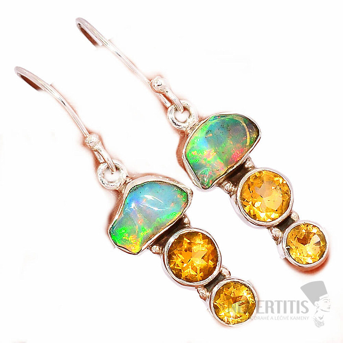 Očarujúce strieborné náušnice so surovými, zaleštenými opálmi, s krásnou hrou farieb, a brúsenými citríny. Ag 925. Pôsobivý a elegantný šperk, od pohľadu navodzujúci radosť a pocity harmónie. Etiópske opály oproti austrálskym opálom doslova hýria až neónovo žiarivými odleskami farieb. Hoci na prvý pohľad na to nevyzerajú, ohňostroj farieb, ktorý z opálu v týchto náušniciach vytryskne pri každom dopade svetla, očarí nielen vás, ale celé vaše okolie. Uvedená váha je celého páru. Kupujete priamo vyobrazený šperk.