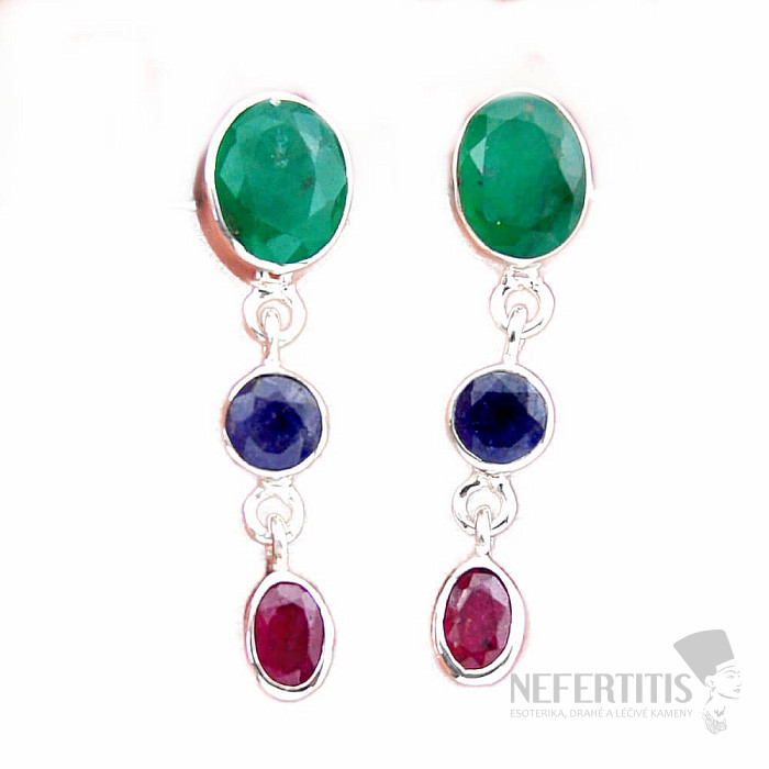 Elegantné a výrazné strieborné náušnice s brúseným indickým smaragdom, brúseným indickým zafírom a brúseným indickým rubínom. Ag 925. Náušnice majú zapínanie na puzetu. Smaragd indický je obchodné označenie prírodného kameňa, najčastejšie sillimanitu či korundu, umelo dofarbovaného do farby smaragdu. Nejde teda o prírodný smaragd. Kupujete priamo vyobrazený pár. Uvedená váha je celého páru.