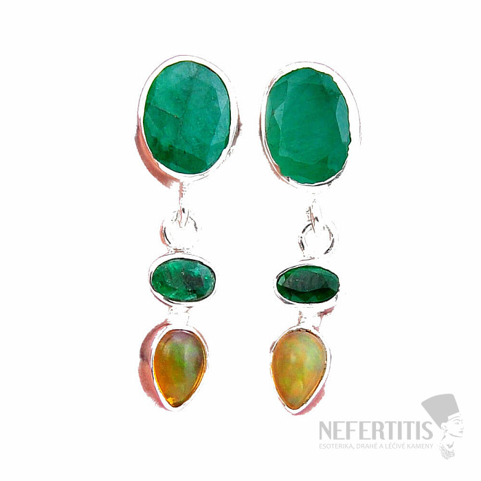 Elegantné a výrazné strieborné náušnice s brúsenými indickými smaragdmi a kabošonom etiópskeho opálu. Ag 925. Náušnice majú zapínanie na puzetu. Smaragd indický je obchodné označenie prírodného kameňa, najčastejšie sillimanitu či korundu, umelo dofarbovaného do farby smaragdu. Nejde teda o prírodný smaragd. Kupujete priamo vyobrazený pár. Uvedená váha je celého páru.