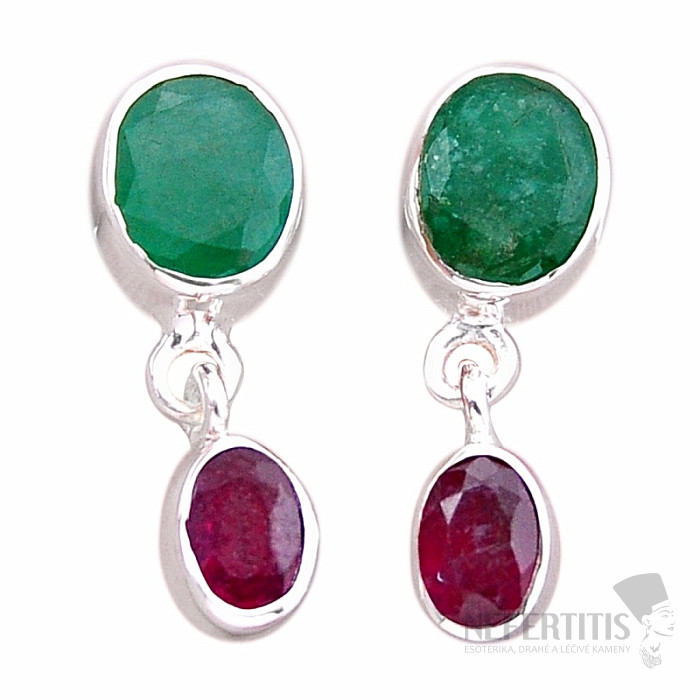 Elegantné a výrazné strieborné náušnice s brúseným indickým smaragdom a brúseným indickým rubínom. Ag 925. Náušnice majú zapínanie na puzetu. Smaragd indický je obchodné označenie prírodného kameňa, najčastejšie sillimanitu či korundu, umelo dofarbovaného do farby smaragdu. Nejde teda o prírodný smaragd. Uvedená váha je celého páru. Kupujete priamo vyobrazený pár.
