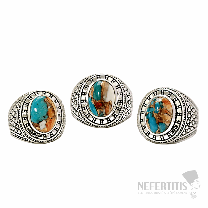 Výsledkom je fascinujúci kompozitný kameň s výraznou farebnou hrou: od oranžových, červených a fialových tónov mušloviny, cez modré odtiene tyrkysu až po medené linky. Spiny Oyster tyrkys predstavuje spojenie mora, zeme a kovu – teda harmónie prírodných živlov.