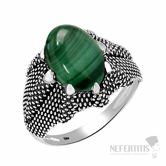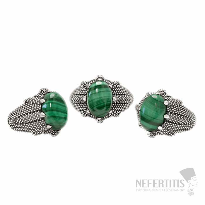Malachit je vsadený do krapien v podobe pazúrov , ktoré dodávajú prsteňa dravý a odvážny vzhľad. Celé telo prsteňa je zdobené štruktúrou pripomínajúcou jaštericu šupiny , vďaka čomu pôsobí neobyčajne a priťahuje pozornosť na prvý pohľad.