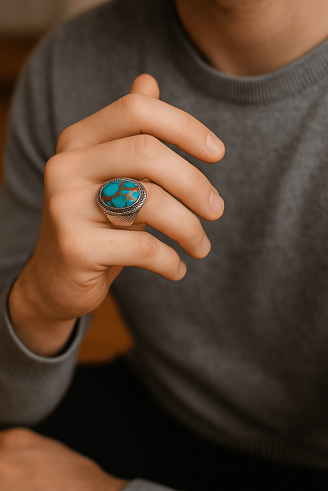 Tento strieborný prsteň s tyrkysom je perfektnou voľbou pre mužov, ktorí chcú šperk, ktorý je na prvý pohľad neprehliadnuteľný. Vďaka väčšiemu kameňu (16 mm) a originálnemu zdobeniu sa hodí ako k voľnočasovému, tak aj elegantnému outfitu.