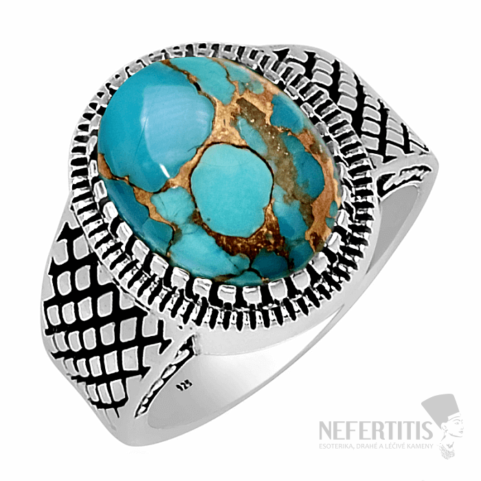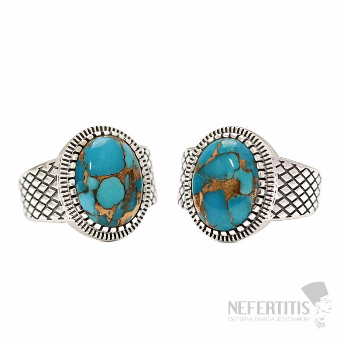 Kameň je tvorený kúskami prírodného tyrkysu spojenými meďou , vďaka čomu má jedinečnú mozaikovú kresbu s kontrastom tyrkysovo modrých a hnedastých žiliek. Obrúčka prsteňa je zdobená rytým vzorom pripomínajúcim šachovnicu , ktorý dodáva šperku moderný aj tradičný charakter zároveň.