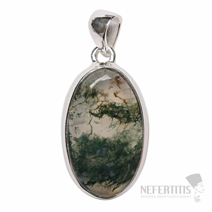 Nádherný strieborný prívesok s machovým achátom. Ag 925. Inklúzia železa vytvára v acháte vzory pripomínajúce mach alebo lišajník. Veľké množstvo inklúzií spoločne s veľkosťou prívesku robí tento šperk očarujúce a úplne nezameniteľný. Kupujete priamo vyobrazený šperk.