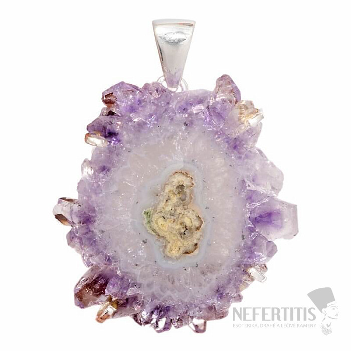 Exkluzívny, okúzľujúci strieborný prívesok z lešteného stredu vzácneho ametystového stalaktitu - kvaple, vznikajúceho hlboko v jaskyni po milióny rokov, ktorého vzniku dá začiatok prvá kvapka minerálnej vody. Ag 925. Obojstranne leštené plátky ametystového stalaktitu sú spojené s vnútorným rastom, novými začiatkami a podporou vyššieho „Ja“. Ich nevšedný vzhľad pripomínajúci okvetné plátky nežných fialových astier robí tento šperk veľmi krásnym. Kupujete priamo vyobrazený šperk.
