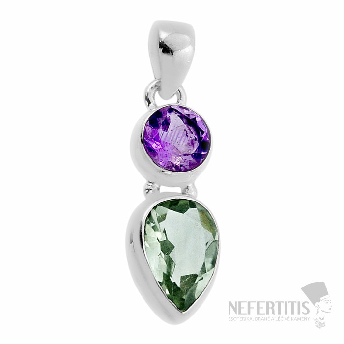 Unikátny prívesok s brúseným zeleným ametystom - prasiolitom a fialovým ametystom. Nechajte sa očariť jemnou a predovšetkým neobvyklou zelenou farbou ametystu. Tento unikátny šperk vynika svojou neobvyklou farbou ametystu. Zelená farba kameňa z tohto prívesku robí vzácny a neprehliadnuteľný skvost. Zelený ametyst sa ako taký v prírode nenachádza, obdobne ako väčšina citrínov na trhu, vzniká úpravou ametystových kryštálov. Prvýkrát bol tento kameň uvedený na trh v Amerike okolo roku 1950, kedy dostal názov prasiolit, ktorý je spojením gréckych slov pre pažítkovo zelenú a kameň. Zelené ametysty pochádzajú väčšinou z Brazílie , zo známych ametystových lokalít ako Minas Gerais a Rio Grande do Sul. Ag 925. Kupujete priamo vyobrazený šperk.