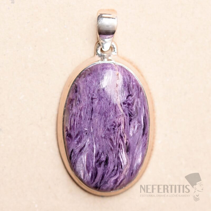 Strieborný prívesok s čaroitom výbornej kvality. Nádherne fialovo sfarbený čaroit vás očarí nielen svojim hodvábnym leskom, ale aj premenou kresby v meniacom sa svetle. Ag 925. Kupujete priamo vyobrazený šperk.
