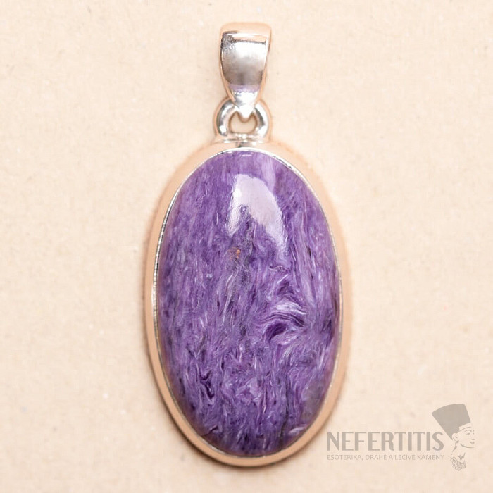 Strieborný prívesok s čaroitom výbornej kvality. Nádherne fialovo sfarbený čaroit vás očarí nielen svojim hodvábnym leskom, ale aj premenou kresby v meniacom sa svetle. Ag 925. Kupujete priamo vyobrazený šperk.