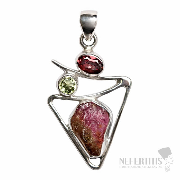 Krásny dizajnový strieborný prívesok s prírodným melónovým turmalínom, brúseným granátom a olivínom . Ag 925. Kupujete priamo vyobrazený šperk.