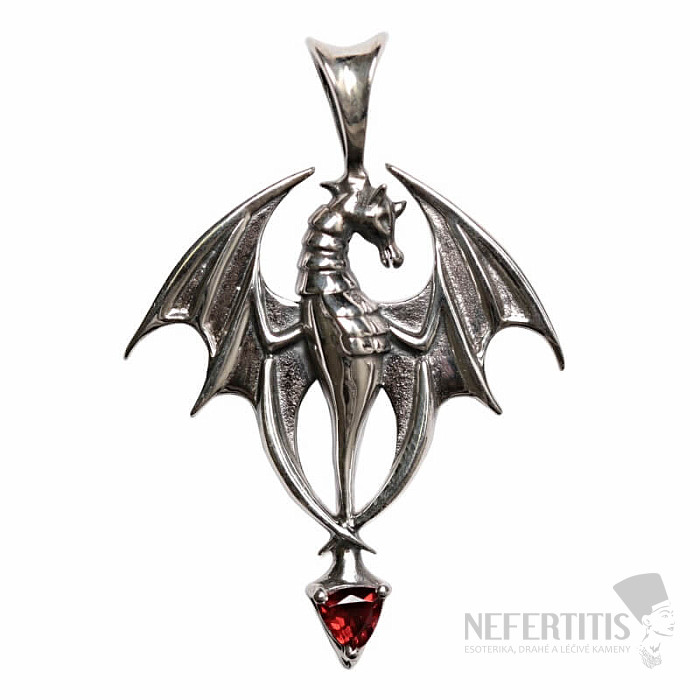 Krásny dizajnový strieborný prívesok v tvare draka s brúseným granátom. Ag 925. Kupujete priamo vyobrazený šperk. Granát je podľa ľudových tradícií kameňom so silnou schopnosťou dodávať energiu, a to vďaka svojej sýto… viac »