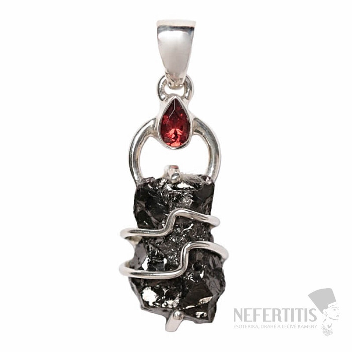 Krásny dizajnový strieborný prívesok s surovým hematitom a brúseným granátom . Ag 925. Kupujete priamo vyobrazený šperk. Hematit je v ľudových tradíciách mocným kameňom, ktorý údajne uzemňuje, ochraňuje, uvádza do… viac »