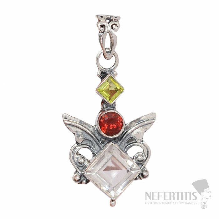 Krásny dizajnový strieborný prívesok s brúseným krištáľom, granátom a olivínom. Ag 925. Kupujete priamo vyobrazený šperk. Krištáľ je po stáročia medzi ľuďmi považovaný za veľmi účinný a univerzálny kryštál , ktorý ako… viac »