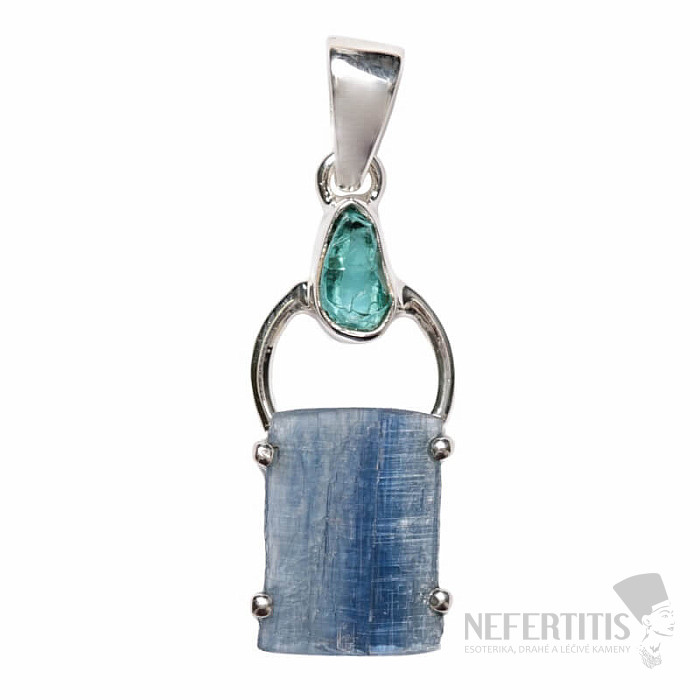 Krásny dizajnový strieborný prívesok s modrým surovým kyanitom a apatitom neón . Ag 925. Kupujete priamo vyobrazený šperk. Kyanit prenáša a zosilňuje energiu, čo z neho robí kameň vhodný pre meditácie a pozitívne… viac »
