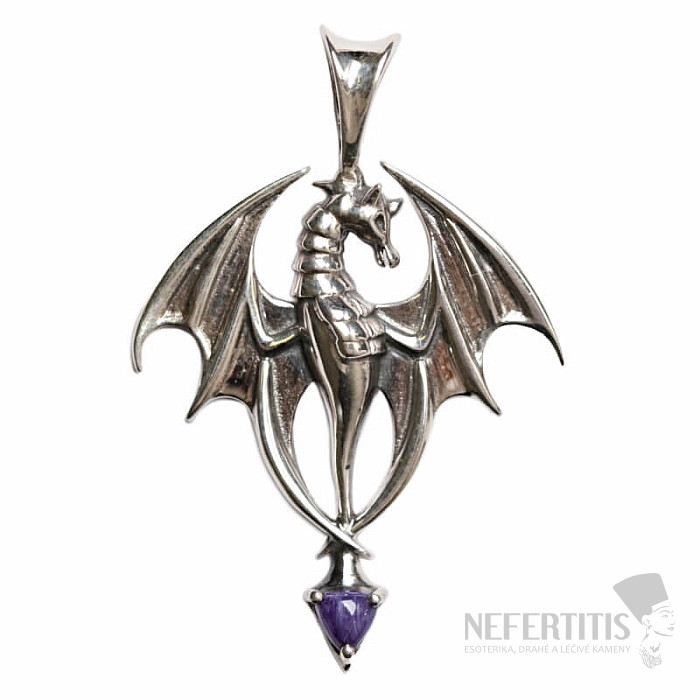 Krásny dizajnový strieborný prívesok v tvare draka s čaroitom . Nádherne fialovo sfarbený čaroit vás očarí nielen svojim hodvábnym leskom, ale aj premenou kresby v meniacom sa svetle. Ag 925. Kupujete priamo vyobrazený šperk.