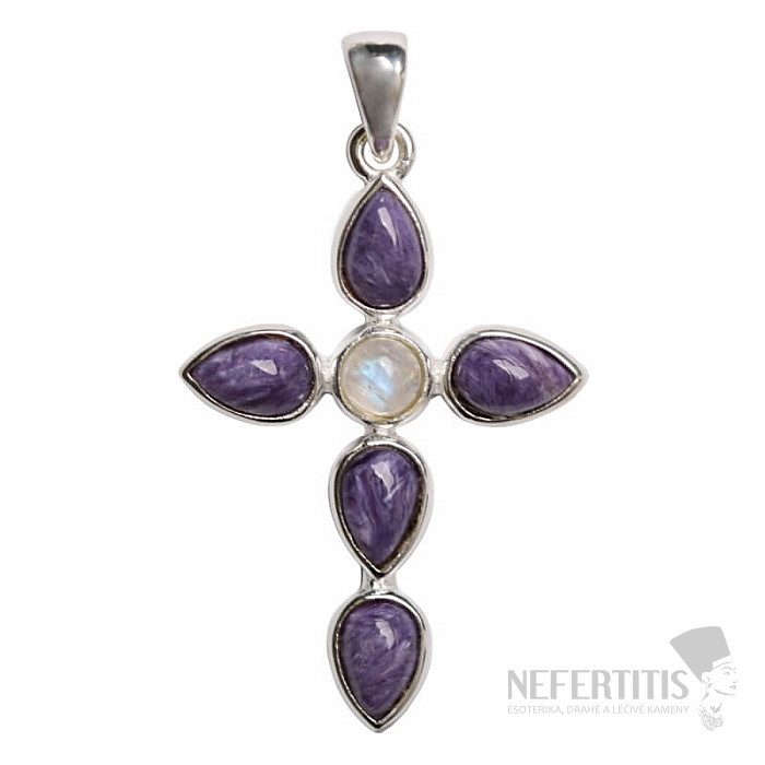 Krásny dizajnový strieborný prívesok v tvare kríža s čaroitmi a mesačným kameňom . Nádherne fialovo sfarbený čaroit vás očarí nielen svojim hodvábnym leskom, ale aj premenou kresby v meniacom sa svetle. Ag 925. Kupujete priamo vyobrazený šperk.
