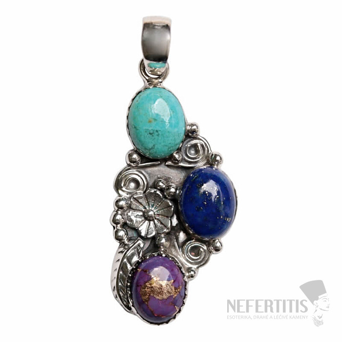 Krásny dizajnový strieborný prívesok s kúskami prírodného, farbeného tyrkysu , spájaných meďou do pôsobivých kabošonov krásnej purpurovej a modrej farby, as lapisom lazuli. Tento typ šperkov získava vo svete na veľkej obľube z dôvodu stále rastúcej ceny jednoliatych kusov prírodného tyrkysu. Takto vytvárané kabošony sú jednou z mála možností, ako si dnes zaobstarať šperk s prírodným tyrkysom za relatívne dostupnú cenu. Ag 925. Kupujete priamo vyobrazený šperk.