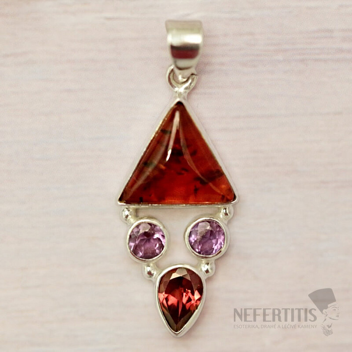 Strieborný prívesok s krásnym medovo sfarbeným baltským jantárom, brúsenými ametystmi a brúseným granátom. Ag 925. Výrazný a vskutku neprehliadnuteľný prívesok. Kupujete priamo vyobrazený šperk.