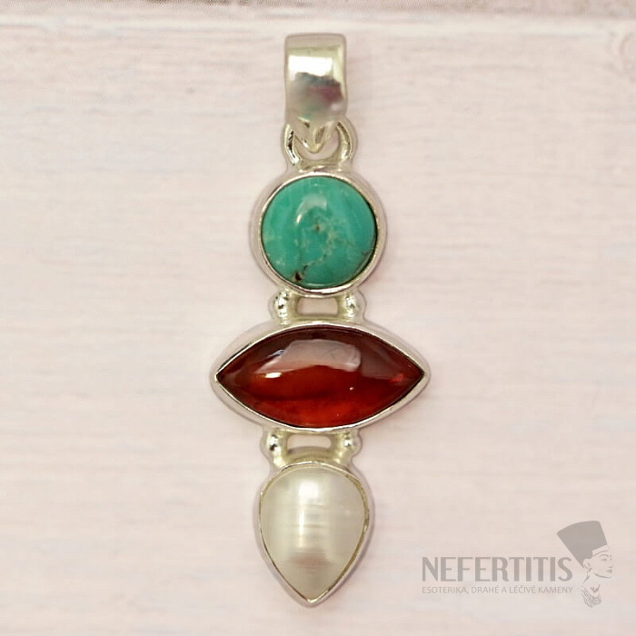 Strieborný prívesok s krásnym medovo sfarbeným baltským jantárom, tyrkysom a perlou. Ag 925. Výrazný a vskutku neprehliadnuteľný prívesok. Kupujete priamo vyobrazený šperk.