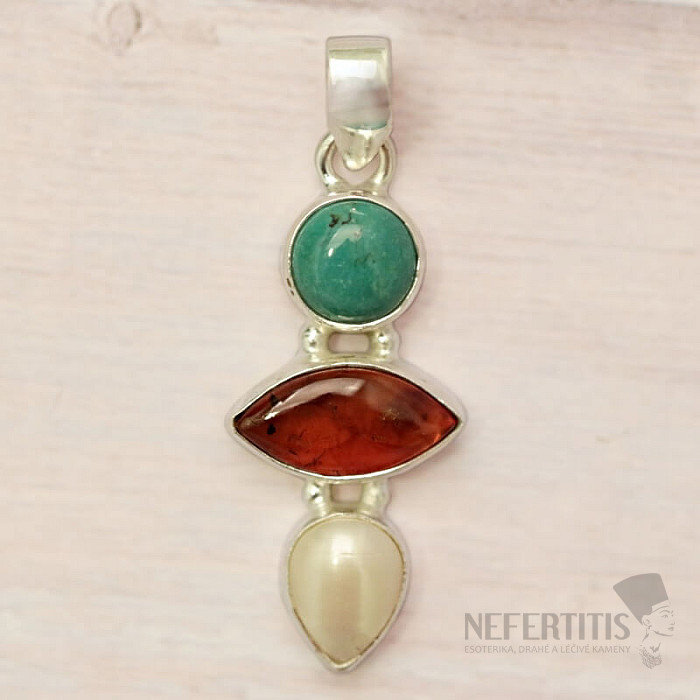 Strieborný prívesok s krásnym medovo sfarbeným baltským jantárom, tyrkysom a perlou. Ag 925. Výrazný a vskutku neprehliadnuteľný prívesok. Kupujete priamo vyobrazený šperk.