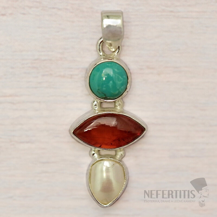 Strieborný prívesok s krásnym medovo sfarbeným baltským jantárom, tyrkysom a perlou. Ag 925. Výrazný a vskutku neprehliadnuteľný prívesok. Kupujete priamo vyobrazený šperk.