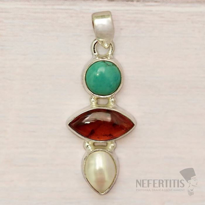 Strieborný prívesok s krásnym medovo sfarbeným baltským jantárom, tyrkysom a perlou. Ag 925. Výrazný a vskutku neprehliadnuteľný prívesok. Kupujete priamo vyobrazený šperk.
