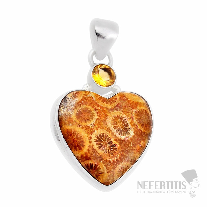 Strieborný prívesok v tvare srdca s krásnym indonézskym fosílnym koralom, ktorého kresba pripomína rozvinuté margaréty, a brúseným citrínom. Iba indonézsky skamenený koral je považovaný za najviac žiaduci a jedinečný na výrobu šperkov, sme preto veľmi radi, že Vám taký môžeme ponúknuť. Ag 925. Kupujete priamo vyobrazený šperk s mimoriadne krásnym koralom s vynikajúcou "kvetinovou" kresbou.